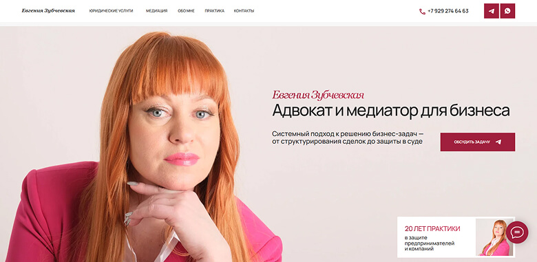 Евгения Зубчевская - адвокат и медиатор с опытом более 20 лет. Для повышения узнаваемости появилась потребность в сайте.
