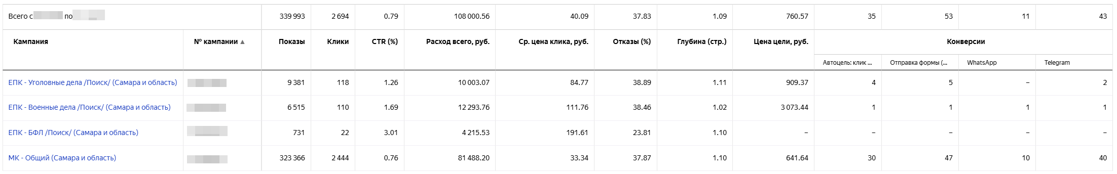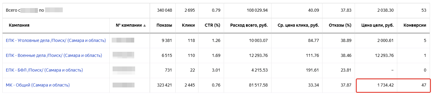 По Мастеру кампаний мы получили только с сайта без учета мессенджеров 47 заявок по 1734 руб./заявка.