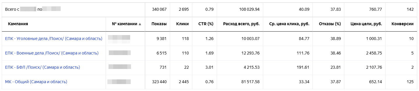 При общем бюджете около 108 000 рублей (без НДС) за 2 месяца стоимость всех конверсий (со всех кампаний) — 760 руб., из них 125 конверсий по стоимости 652 руб. приходится на Мастер кампаний