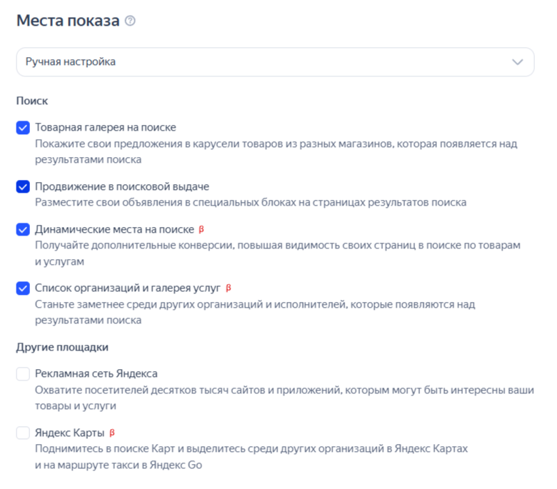 Аналогично поступили и с местами показа для РСЯ, чтобы максимально охватить аудиторию.