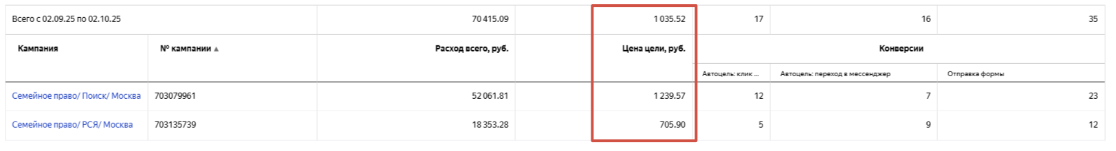 За 27 дней работы кампаний, было расходовано 70 415 ₽ (без ндс) при этом получено 68 конверсий (а именно 35 заявок на сайте и 17 кликов на телефон и 16 обращений в вот сап). Средняя цена конверсии составила 1035 рублей.